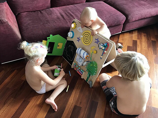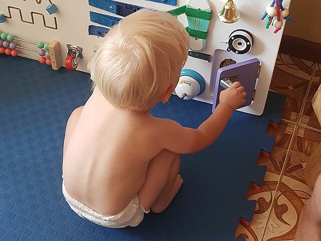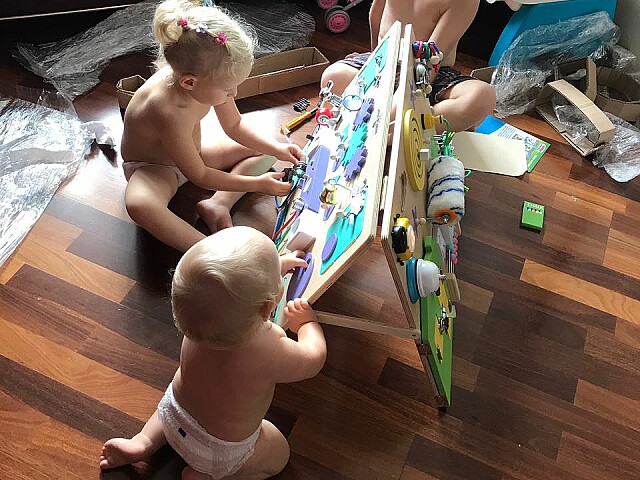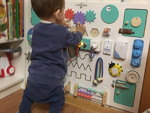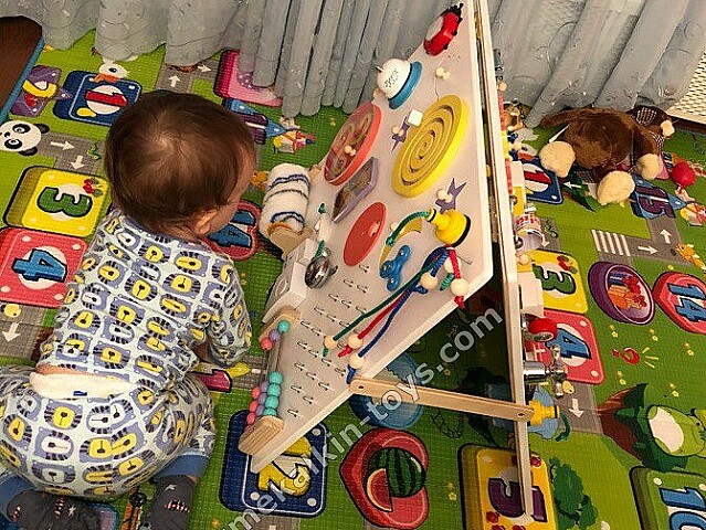 Спасибо за бизиборд «Классик»! Дочка 9 месяцев сразу встала без опоры, чтобы поиграть! А когда приходят старшие братья (1 и 3 года) их втроем не оторвать от этой игрушки. Уверена, что служить она будет долго, так как элементов много и по мере взросления интерес будет просто переходить на другие элементы. Все сделано идеально! Очень довольны!