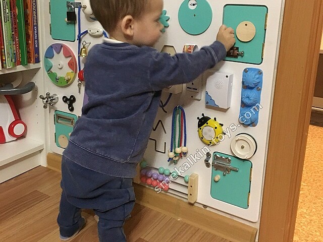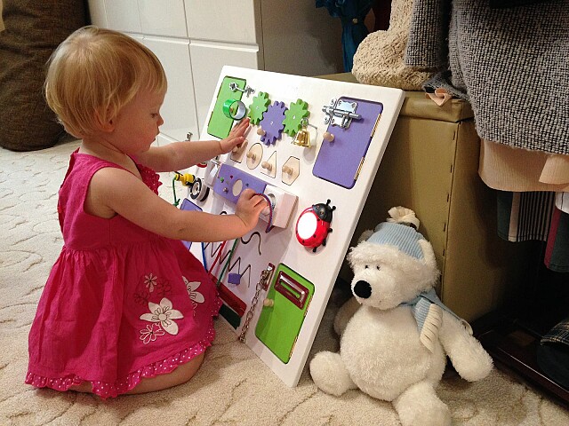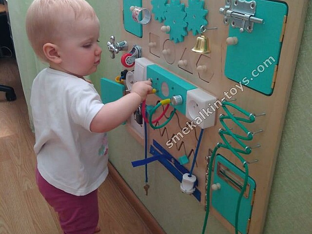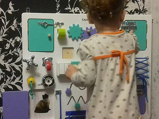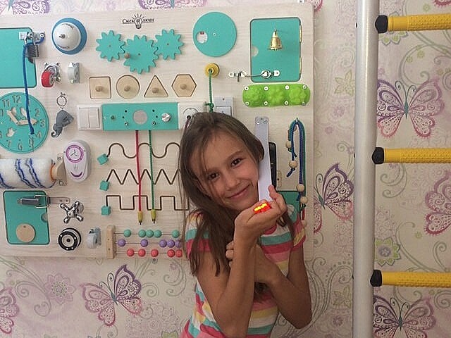 «Добрый день! Наконец-то забрала наш бизиборд, всё отлично. Качественно сделан и в живую намного лучше смотрится, чем на картинке! Нашей малышке как раз! Пока положила на пол, она всё с интересом трогает и крутит. Вечером муж придёт домой, прикрутим к стене. Спасибо!) ?»
