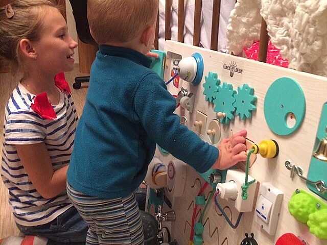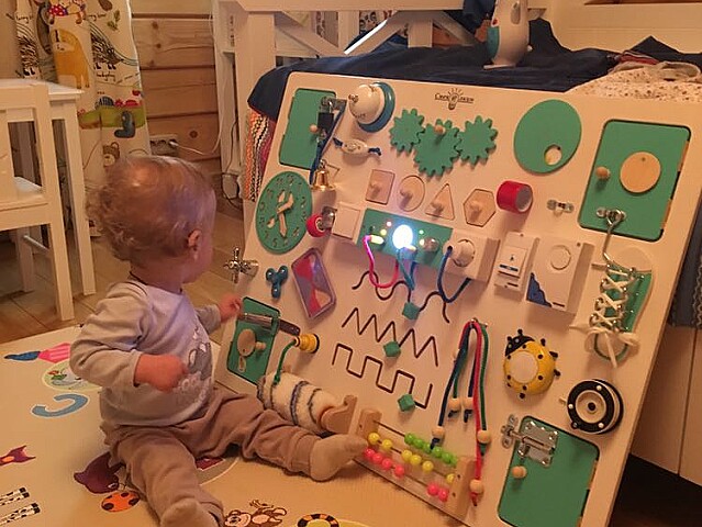 Хотим передать благодарность всем, кто принимал участие в создании нашей прекрасной развивающей доски (бизиборд стандарт)! Бизиборд надолго привлекает внимание 8-месячного сына возможностью покрутить-понажимать-подергать, красочными картинками и разнообразными тактильными ощущениями. В общем, ребенок в восторге! Хочу отдельно отметить внимание разработчиков и мастеров к деталям: все выполнено очень профессионально, безопасно даже для малыша и оформлено с большим вкусом. Понравилась цветовая гамма. Через некоторое время, думаю, закажем бизиборд побольше) Также огромное спасибо Елене за быструю доставку и своевременные ответы на все возникающие вопросы!